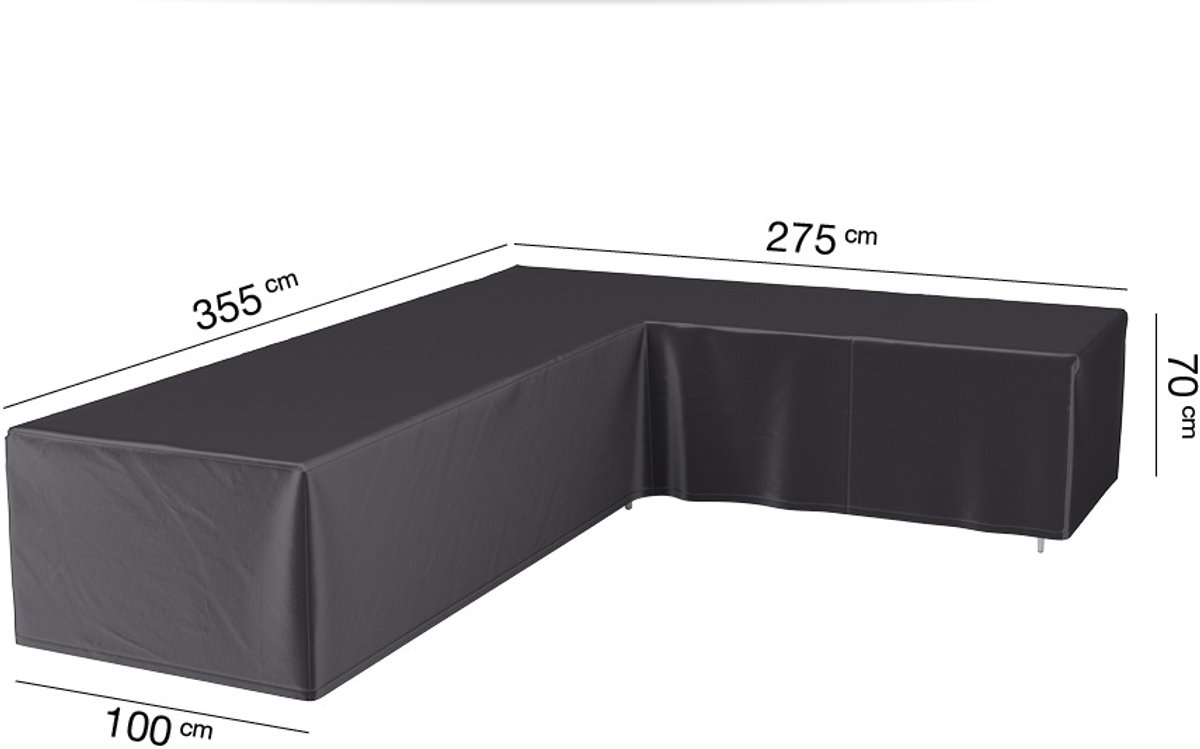 De Platinum AeroCover loungebankhoes L-vorm (355x275x100xH70cm) Rechts biedt betrouwbare bescherming voor loungebanken in L-vorm 355x275x100xH70cm met een 90° hoek. Het ademende membraan helpt vocht naar buiten te transporteren en houdt tegelijkertijd vuil, stof en regen van buitenaf tegen. Dit is erg belangrijk om schimmelvorming op je loungebank tegen te gaan en de levensduur ervan te verlengen.