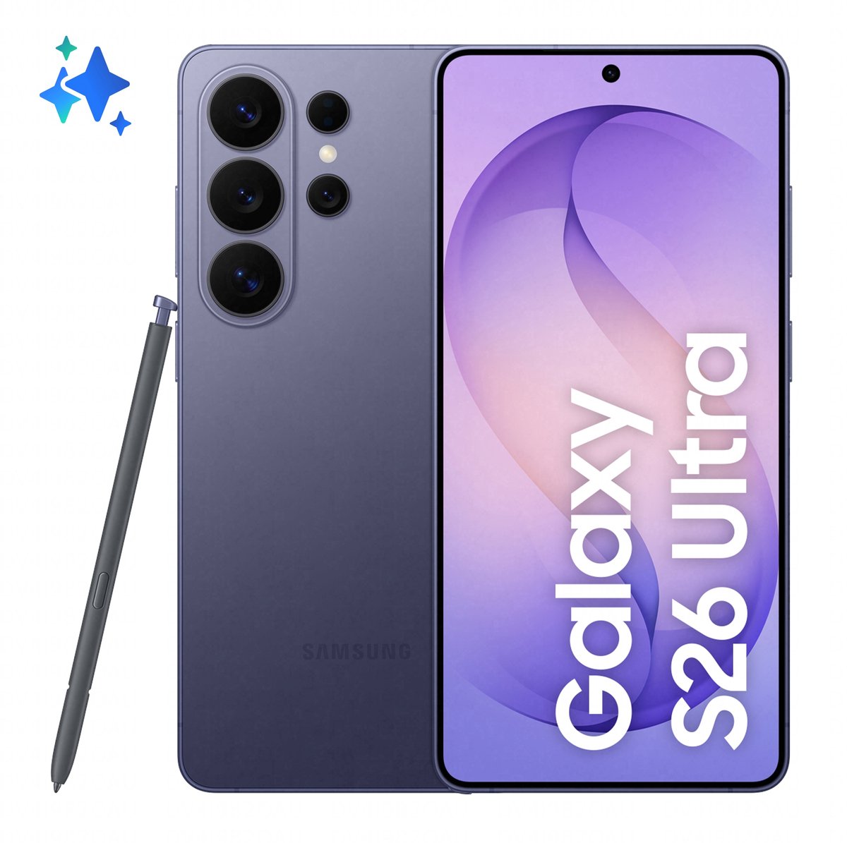 Samsung Galaxy S26 Ultra . Beeldschermdiagonaal: 17,5 cm (6.9"),Resolutie: 3120 x 1440 Pixels. Processorfamilie: Snapdragon, Processormodel: 8 Elite Gen 5. RAM-capaciteit: 12 GB, Interne opslagcapaciteit: 512 GB. Resolutie camera achterzijde (numeriek): 200 MP, Type camera achterzijde: Quad camera. SIM-kaart-capaciteit: Dual SIM. Inclusief besturingssysteem: Android 16.0. Capaciteit van de accu/batterij: 5000 mAh. Kleur van het product: Violet. Gewicht: 214 g
