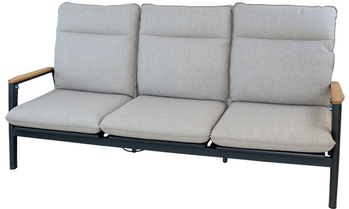 Merino lounge 3-zitsbank midnight grey sunny crème. De 3-zitsbank Merino is gemaakt van een aluminium frame en afgewerkt met trendy rope en een teak armleuning. De lounge bank is ook zeer gemakkelijk te verstellen zijn dankzij de ingebouwde gasveren. De lounge bank wordt geleverd inclusief kussens.