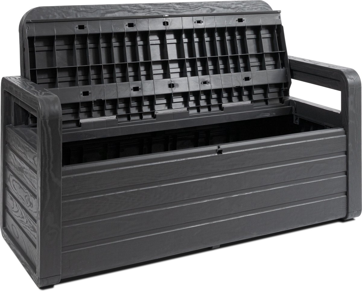 Met deze Toomax FOREVERSPRING topbergbank met 263 liter inhoud heeft u de ideale opbergruimte voor uw tuinspullen. Of het nu gaat om kussens, accessoires of andere tuinbenodigdheden, u bergt het snel en makkelijk op in deze box, annextuinbank. Gemaakt van weerbestendig kunststof is de box ook nog eens spatwaterdicht, zodat uw spullen droog en vrij van schimmel opgeborgen kunnen worden. De houtnerf in het kunststof geeft deze tuinbank/box een luxe uitstraling Ook er een speciale voorziening om de box te vergrendelen. Kortom, een box waar u jarenlang plezier van kunt hebben.