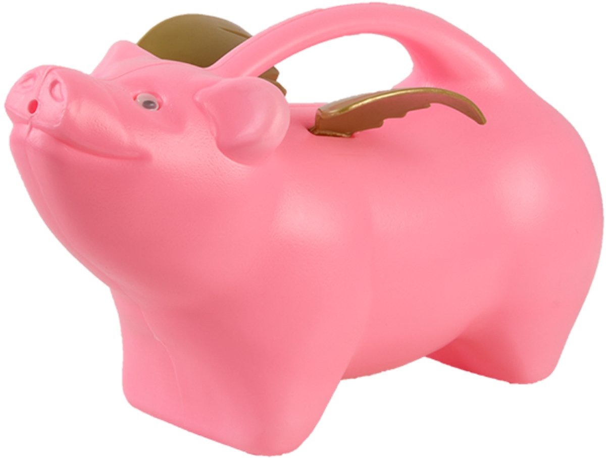Trendy roze 'Vliegend varken' gieter met meedraaiende pupillen en goudkleurige vleugels. Gieter, gemaakt van kunststof. Volume: circa 1,7 Liter. lees meer over dit product
