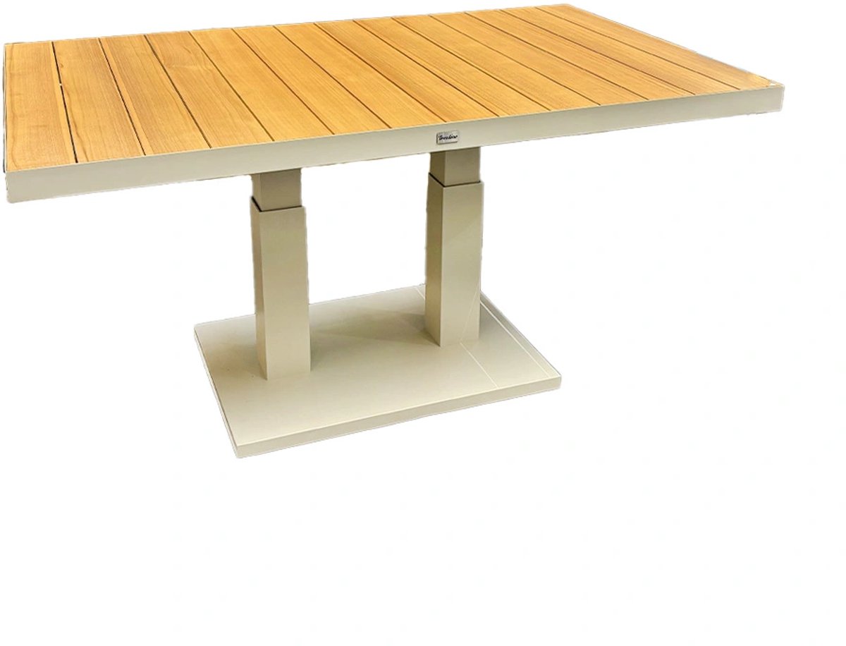 De Trestino Manilva Verstelbare Loungetafel - Latte heeft een moderne uitstraling en kan goed gecombineerd worden. De tuintafel is in hoogte verstelbaar waardoor je deze als salontafel en eettafel kunt gebruiken.De tuintafel heeft een aluminium onderstel en een tafelblad van teak. De gebruikte materialen zijn duurzaam, weerbestendig en onderhoudsvriendelijk.Bij gebruik van een hoes over de tafel (niet inbegrepen): zorg ervoor ... lees meer over dit product
