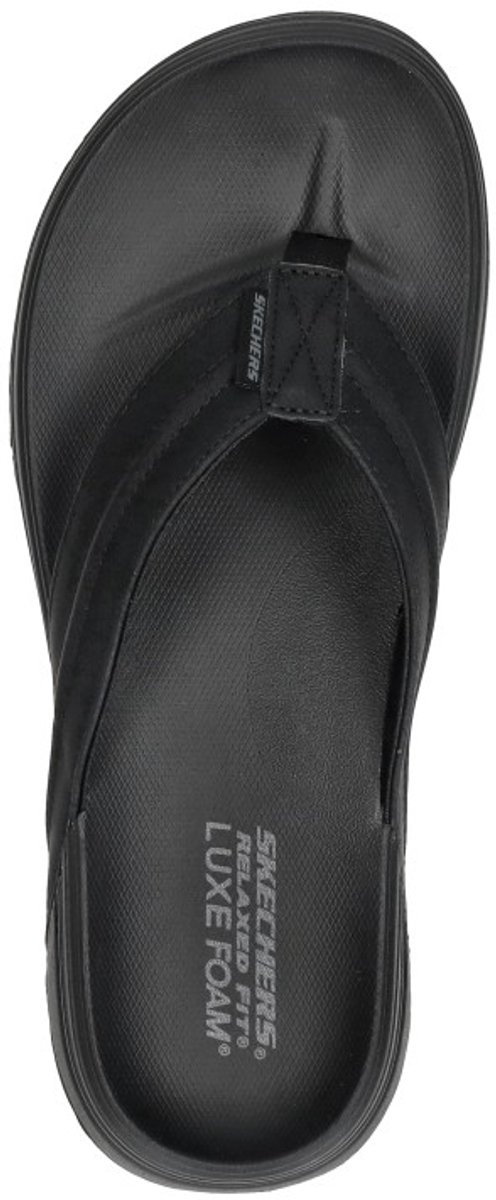 Relaxed Fit heren teenslipper Skechers Patino - Marlee heeft een bovenwerk van van glad kunstleer met stikseldetail. Het comfortabele voorgevormde Luxe Foam® voetbed geeft goede demping. Het Relaxed Fit®-ontwerp geeft een ruime, comfortabele pasvorm. Deze 3-punts teenslipper heeft een flexibele tractiebuitenzool met grip. Dit model is gemaakt van 100% veganistische materialen.