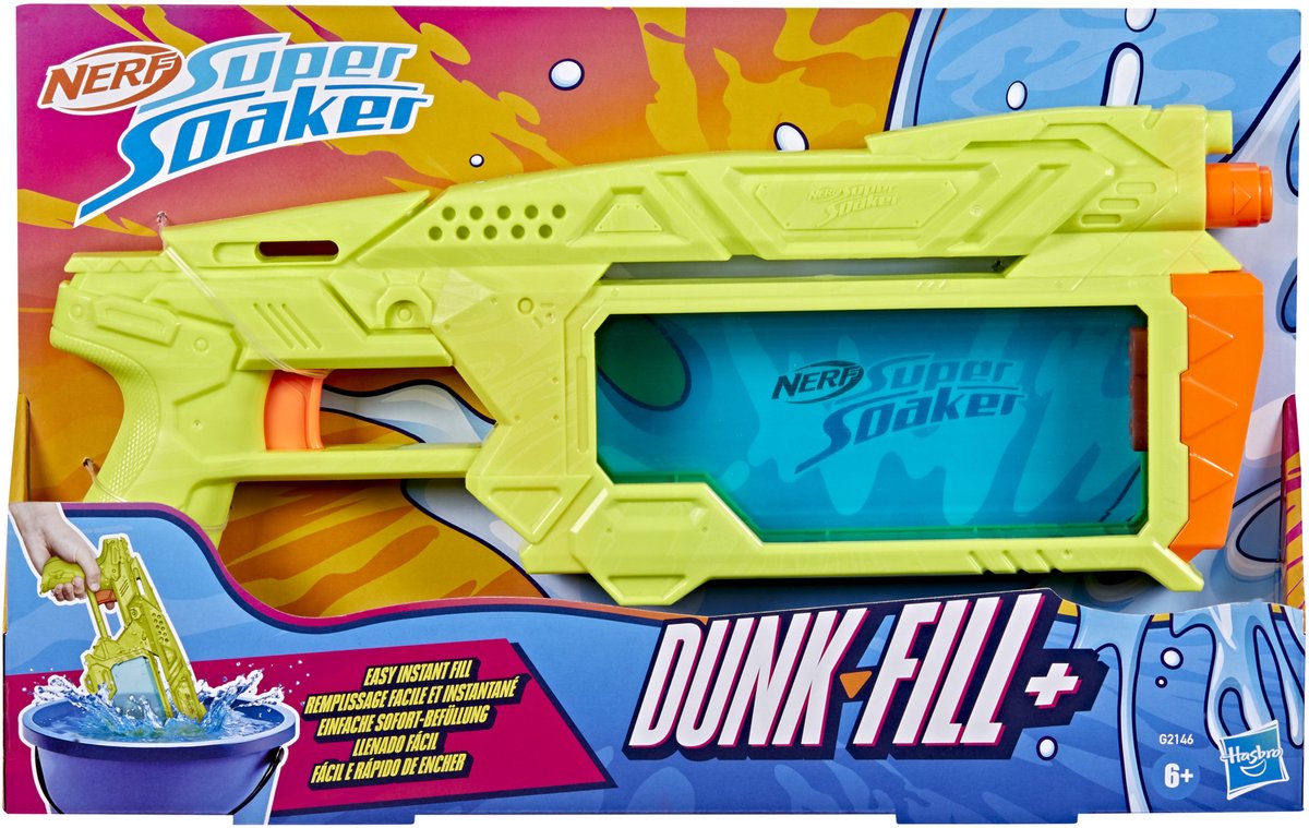De Nerf Super Soaker Dunk-Fill+-waterblaster maakt een watergevecht supereenvoudig! Dompel het reservoir in water en het loopt direct vol! Niet wachten, geen knoppen, geen doppen - gewoon dompelen en klaar. In de blaster kan 358 ml water. Haal de trekker over en laat het watergevecht beginnen! Het reservoir is doorzichtig, zodat je precies weet wanneer je opnieuw moet dompelen. Nerf Super Soaker-blasters zijn perfect om mee buiten te spelen en het zijn coole cadeaus waarmee je iedereen nat spuit!