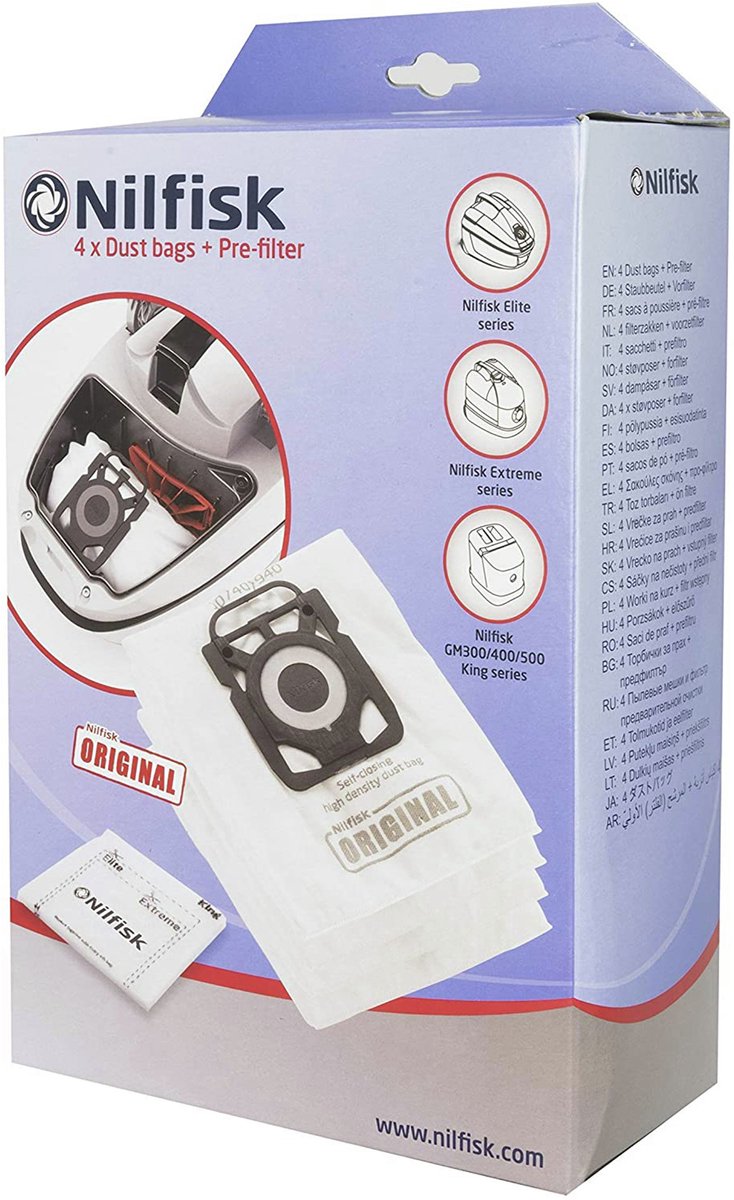 Nilfisk Elite stofzuigerzakken, inhoud bevat 4 stofzakken en voorfilter voor de motor. De stofzuigerzakken zijn van een hoogstaande kwaliteit en voorzien van een afsluit-deksel bij de ingang van de stofzuigerzak, er kan dus geen stof uit de stofzuigerzak ontsnappen.