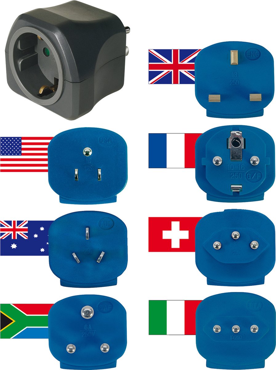 Deze reisstekker set bestaat uit 7 versies voor gebruik in meer dan 150 landen. Een veilige, universele netadapter waarmee elektrische apparatuur met een Europese stekker kan worden aangesloten op andere aansluitingen in het buitenland. lees meer over dit product