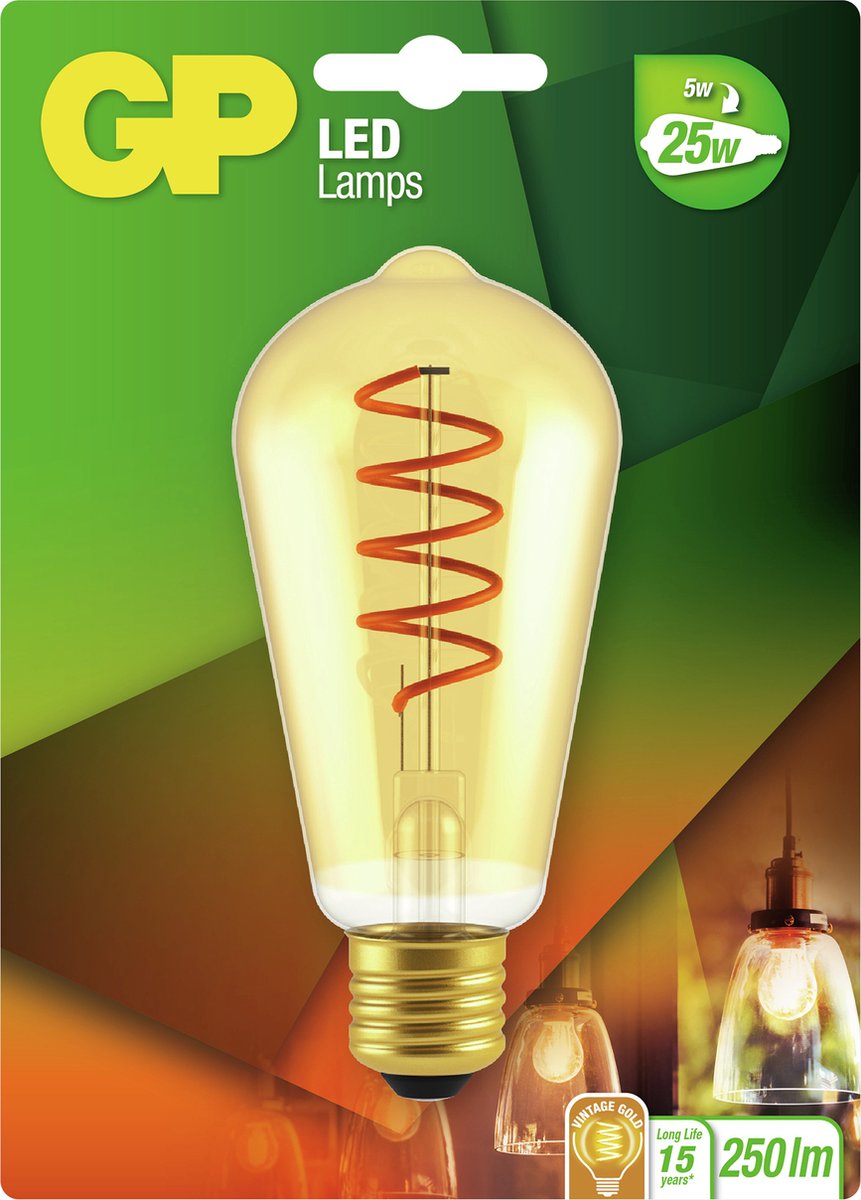 Gp Led Spiralflame St64 5w E27Uitvoering: LED lamp vintage gold / ST64Fitting: E27Lampvorm: Edison (ST64)Vermogen: 25 WattEnergieverbruik: 5 WattLichtsterkte: 250 LumenLichteffect: FlameEnergie efficiëntieklasse: ASpanning: 220 - 240 VoltKleurtemperatuur: 2700K (warm wit)Lengte: 14,8 cmDiameter: 64 mmBrandtijd: 15.000 uurLevensduur: 15 jaarDimbaar: NeeVerpakkingsinhoud: 1 lees meer over dit product