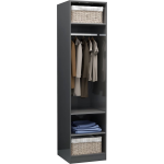 De kledingkast beschikt over 3 kleine vakken en 1 groot vak met een handige ophangstang. Hierdoor heb je voldoende ruimte voor zowel je langere outfits als opgevouwen kledingstukken en accessoires, zoals truien, jeans, hoeden en handtassen.