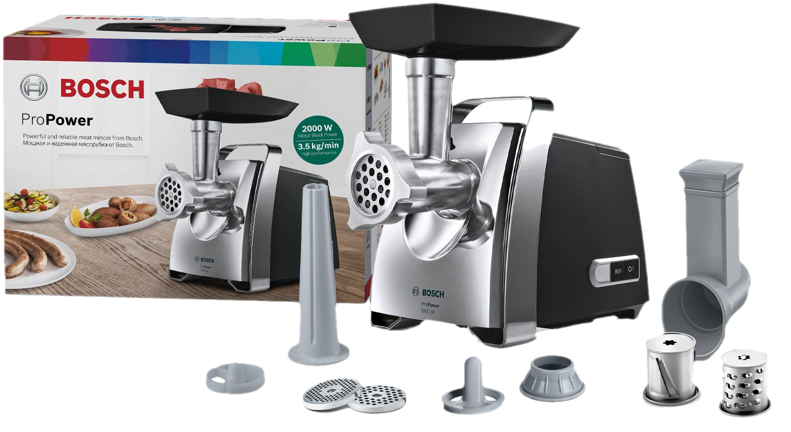De Bosch MFW67440 ProPower is een veelzijdige vleesmolen met meer dan 10 verschillende functies. Of je nu vlees en vis wilt hakken, groenten wilt versnipperen of kaas wilt malen, met dit apparaat is het allemaal mogelijk. De sterke motor met 2000 Watt blocking power zorgt voor een snelle verwerking van maar liefst 3,5 kg vlees per minuut. Dankzij de meegeleverde toebehoren bereid je eenvoudig vis, kebbe of worst. De rubberen zuigvoetjes zorgen voor stabiliteit en veiligheid tijdens het gebruik. Bovendien is de vleesmolen voorzien van een geïntegreerde opslag voor de accessoires en gemakkelijk op te bergen dankzij het handvat en de snoeropberging.