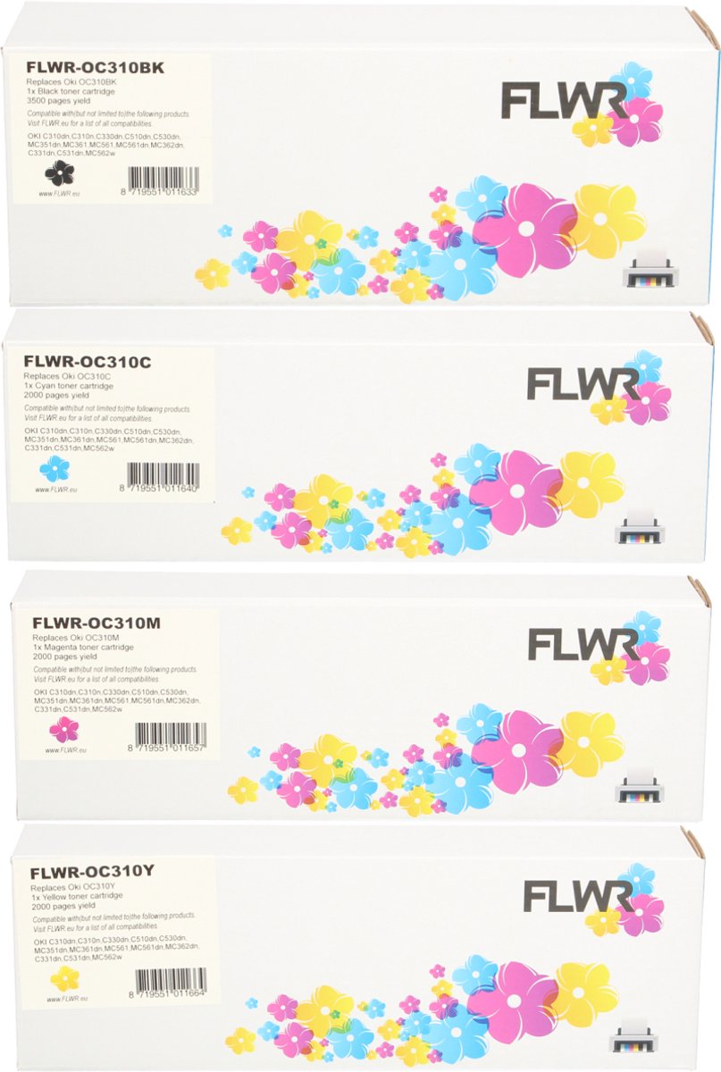 FLWR toner 444698 serie 4-pack zwart & kleur totaal pagina bereik van 11500 pagina's. Ter vervanging van Oki 4469803 (zwart),444704 (geel),44496705 (magenta),44469706 (cyaan).