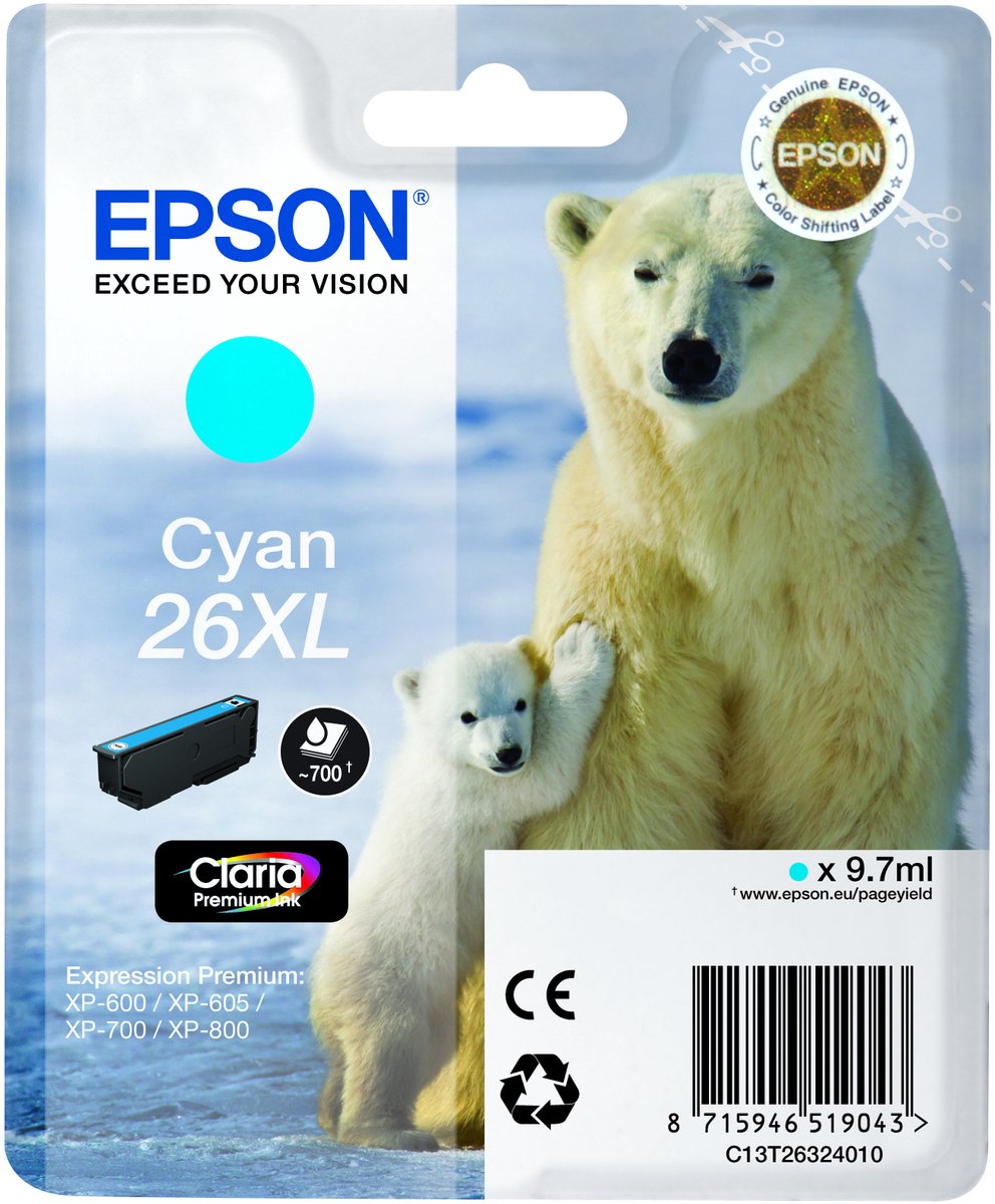 Epson C13T26324010|26XL Inktcartridge cyaan XL, 700 Paginas, Inhoud 9,7 ml voor Expression Premium XP-600/XP-605/XP-700/XP-800 lees meer over dit product
