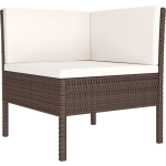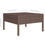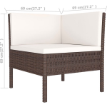 De loungeset is uitgevoerd in een elegante bruine kleur, terwijl de kussens crèmewit zijn. De afmetingen van de hoekbank zijn 69 x 69 x 69 cm (B x D x H),de middenbank is 57 x 69 x 69 cm (B x D x H) en de zitting is 57 x 57 cm (B x D). De zithoogte vanaf de grond bedraagt 35 cm en de afmetingen van de theetafel zijn 60 x 60 x 35 cm (B x D x H).