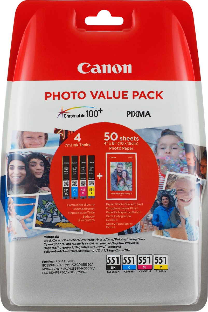 Kies voor het gemak van een Value Multipack bestaande uit Black, Cyan, Magenta en Yellow CLI-551 inktcartridges van 7 ml en 50 vel 4" x 6" Photo Paper Plus Glossy II voor je PIXMA-printer. Met originele Canon-inkt ben je verzekerd van gemiddeld 35% meer kwaliteitsprints dan imitatiecartridges. Daarnaast levert originele Canon-inkt altijd consistente kwaliteit en betrouwbaarheid, waardoor je kunt printen met minder stress.