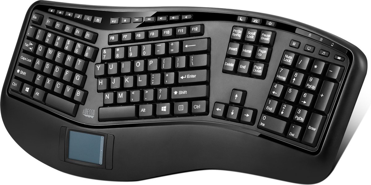 Het Adesso Tru-Form 4500 2,4 GHz draadloos ergonomisch touchpad-toetsenbord heeft veel verschillende unieke eigenschappen die dit toetsenbord uitstekend maken. De draadloze technologie van het toetsenbord kan tot 9 meter werken. Het heeft een ergonomisch contourontwerp, wat betekent dat het de onderarm spieren minimaliseert van draaien en pijn van het carpale tunnelsyndroom. Dit bevordert ook de natuurlijke positie van handen, polsen en onderarmen voor maximaal comfort. De Tru-Form 4500 heeft een ingebouwd touchpad dat volledige muisbesturing biedt met minder spierbewegingen voor maximaal comfort. Veel functies zijn ook te vinden op het toetsenbord, zoals multimedia-sneltoetsen, power / utility-sneltoetsen, verschillende schakelaars en talloze indicatoren.