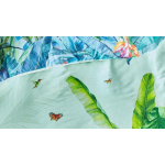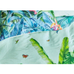 Laat je meevoeren naar een weelderige oase van kleur en sereniteit met het prachtige Dekbedovertrek Beddinghouse Selva - Green. Dit levendige dekbedovertrek brengt een exotisch landschap tot leven, waar kleurrijke bloemen, weelderige planten en exotische bananenbomen floreren. Vlinders dansen tussen de bloemen, waardoor een betoverend schouwspel van kleuren ontstaat. De heldere tinten groen, blauw, roze, rood, geel en oranje komen op een magische wijze tot leven dankzij de natuurlijke glans van het katoensatijn. Het dekbedovertrek en de bijpassende kussenslopen hebben een rustgevend effen groene achterkant, waardoor dit dekbedovertrek veelzijdigheid biedt voor elke slaapkamerstijl.