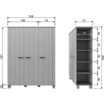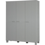 De robuuste kledingkast Dennis is een ruime hang/leg kast van Nederlands design, gemaakt door het kwalitatieve merk WOOOD. Deze 3-deurskast, met afmetingen van 158x55 cm en een hoogte van 202 cm, is gemaakt van geborsteld grenen en afgewerkt in betongrijs.