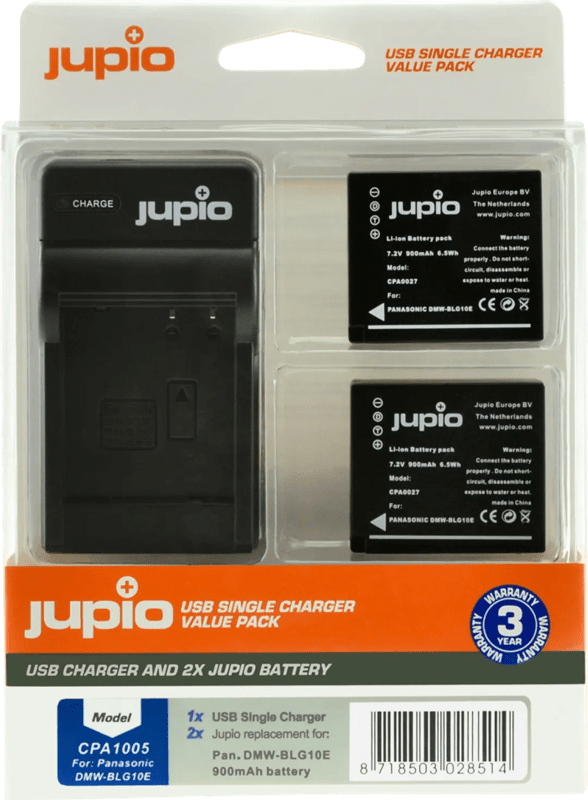 De Jupio Kit met 2x Battery DMW-BLG10 + USB Single Charger is het ideale alternatief voor de originele Panasonic DMW-BLG10. Met twee batterijen van 900mAh capaciteit en een handige oplader, bent u altijd voorzien van stroom voor uw camera. Ideaal voor op vakantie of andere situaties waarin u veel foto's wilt maken. De kit is van hoge kwaliteit en geschikt als alternatief voor de Panasonic DMW-BLG10.