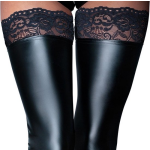 Maak elke outfit een succes met deze sexy wetlook kousen! Deze kousen zijn gemaakt van glad materiaal met een matte glans, waardoor ze een opvallende en verleidelijke uitstraling hebben. De top van de kousen is voorzien van een zwart kanten detail dat extra verleiding toevoegt aan je look. Bovendien zijn deze kousen voetloos, waardoor ze geschikt zijn voor elke maat.