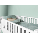 Het Nordic hoogslaper XL bed is voorzien van beuken traptreden met uitgefreesde groeven voor meer grip tijdens het beklimmen van het bed. De uitgefreesde handgrepen zorgen voor extra veiligheid. Bovendien kan de trap zowel aan de linker- als rechterkant van het bed geplaatst worden, afhankelijk van je voorkeur en de indeling van de kamer. Het bed is afgewerkt met een dekkende witte lak op waterbasis, veilig voor kinderen en milieuvriendelijk. Het hout is afkomstig uit Europese bossen, wat bijdraagt aan een duurzaam product.