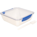 Transparant met blauwe lunchbox met vorkje 1000 mlDeze transparante lunchbox met blauwe klip sluitingen is de ideale broodtrommel om je lunch in stijl mee te nemen. Met een inhoud van 1000 ml biedt hij voldoende ruimte voor al je favoriete gerechten. Wat deze lunchbox echt uniek maakt, is het apart uitneembare vakje met een inhoud van ongeveer 400 ml. Hierdoor kun je je maaltijd gemakkelijk organiseren en voorkom je dat vers... lees meer over dit product