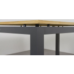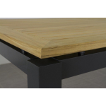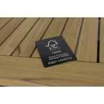 Het aluminium onderstel van de tafel is uitgevoerd in een stoere donkergrijze kleur, terwijl het tafelblad gemaakt is van robuust teakhout. Deze materialen zijn niet alleen duurzaam en weerbestendig, maar ook zeer onderhoudsvriendelijk. Het teakhouten blad is voorzien van een FSC keurmerk, wat garandeert dat het afkomstig is uit verantwoord beheerde bossen.