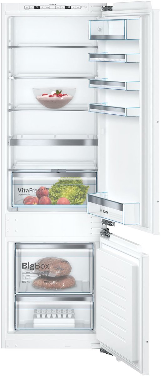 Ontdek de Bosch Serie 6 KIS87AFE0 koel-vriescombinatie, een inbouwapparaat dat uitblinkt in efficiëntie en gebruiksgemak. Met twee verschillende koelcircuits biedt dit apparaat het voordeel van afzonderlijke regeling voor koelen en vriezen. Het elektronische regelsysteem maakt het eenvoudig om temperaturen onafhankelijk in te stellen, waardoor uw voedsel langer vers blijft. Dankzij de intelligente invertertechnologie past de compressor zijn vermogen aan op basis van continu bewaakte temperaturen, waardoor energie wordt bespaard en de levensduur van uw voedsel wordt verlengd.