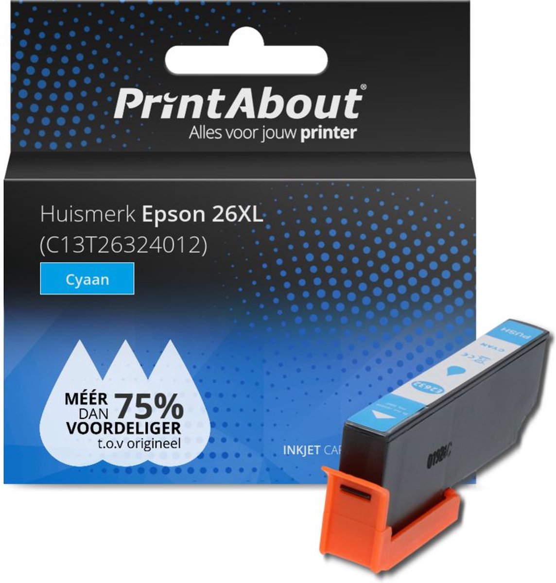 Met de Huismerk Epson 26XL (C13T26324012) Inktcartridge Cyaan Hoge capaciteit bespaar je direct op jouw printkosten. De Huismerk Epson 26XL (C13T26324012) Inktcartridge Cyaan Hoge capaciteit bevat meer inkt ten opzichte van het origineel. Hierdoor dalen jouw printkosten aanzienlijk. Je bespaart in totaal 75% per afdruk ten opzichte van de originele inktcartridge. Eigenlijk krijg je dus standaard korting als je kiest voor het PrintAbout huismerk.
