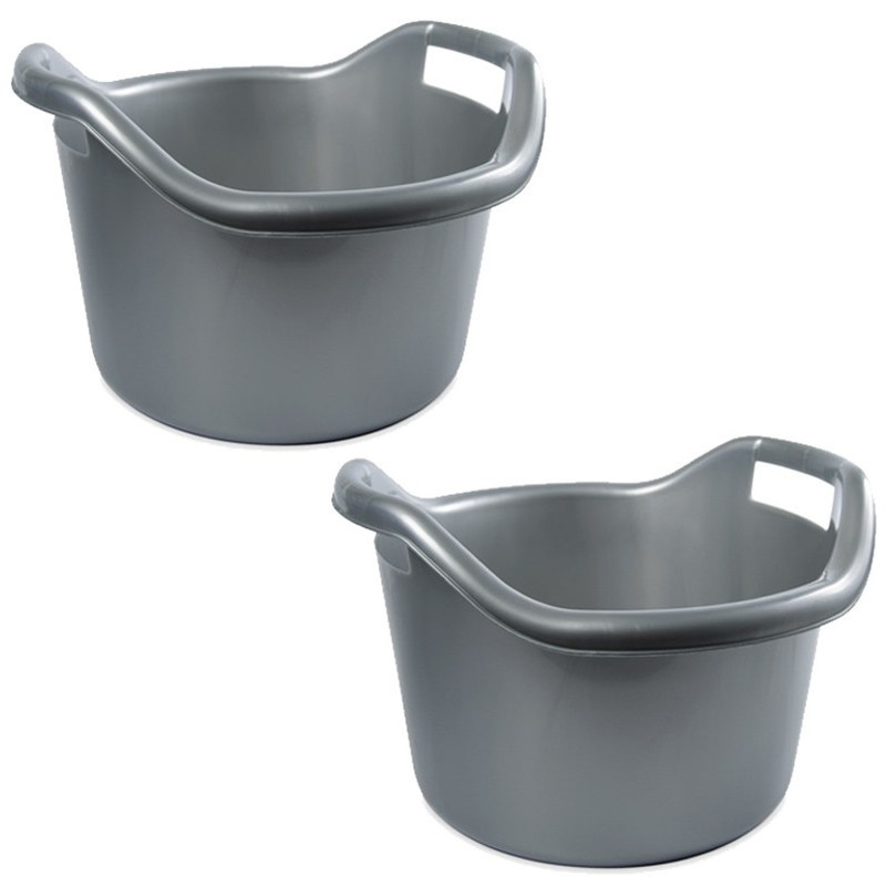 Hega Hogar 2x Schoonmaakemmers afwasteilen met hengsels 14 liter zilver 41 x 24 cm - Emmers - Kunststof/plastic emmer/afwasbak met hengsels/handvatten - Silver