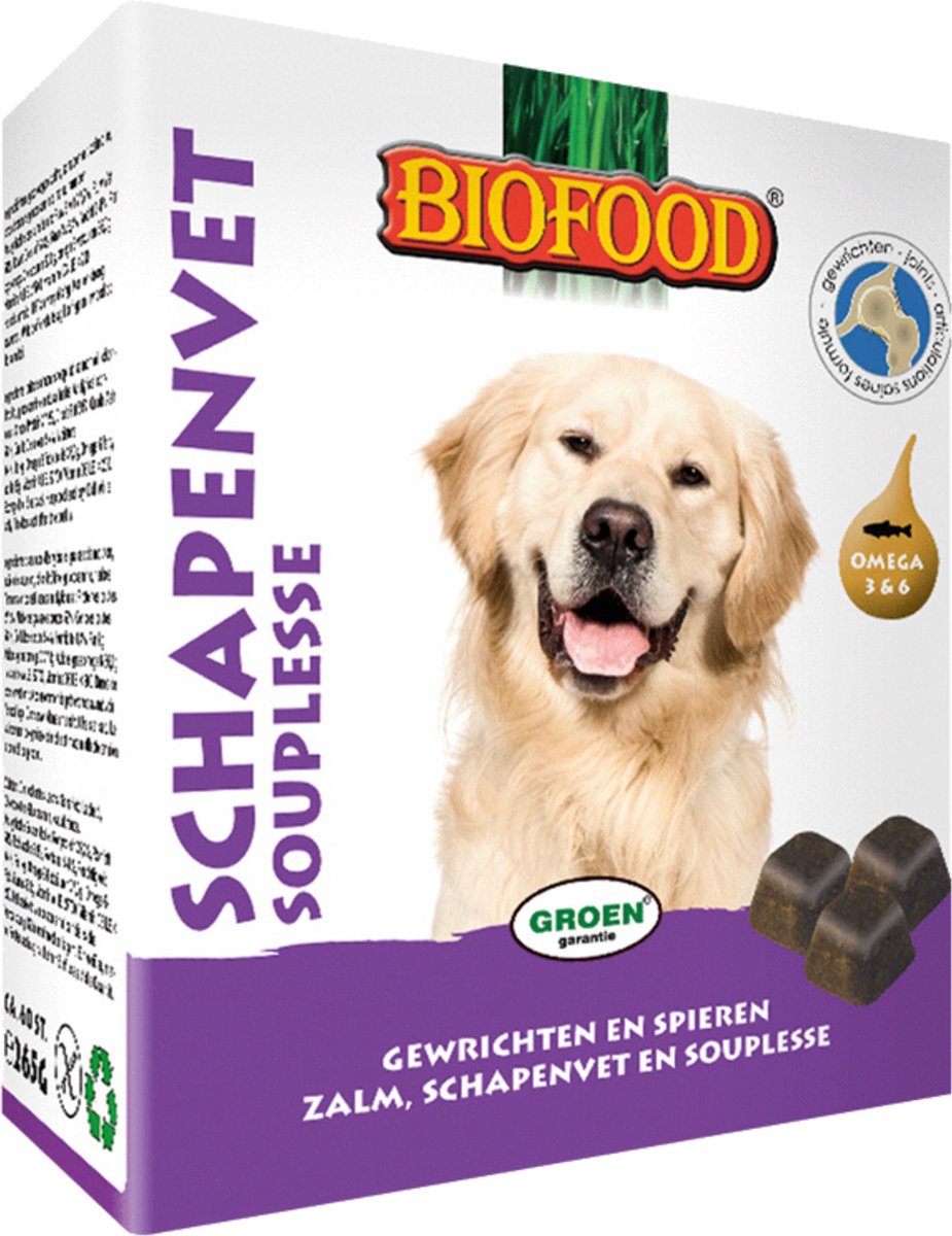 Schapenvet Souplesse van Biofood is verkrijgbaar in een verpakking met 40 stuks. Bestel deze hoogwaardige hondensnacks nu in onze webshop en geef je hond de extra ondersteuning en verwennerij die hij verdient!