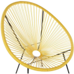 Creëer een vrolijke en trendy sfeer op je balkon met deze balkonset in geel. De set bestaat uit een kleine ronde tafel en twee comfortabele draadstoelen. De stoelen zijn gemaakt van stevig en onderhoudsvriendelijk geel kunststof rotan, gecombineerd met een stabiel zwart stalen frame.