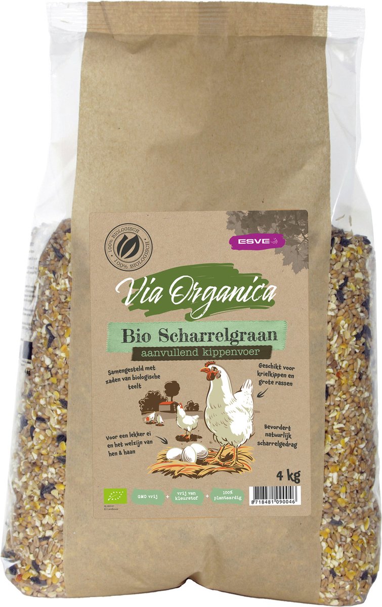 Biologisch gemengd graan - Een biologisch eitje van je eigen kippen! Via Organica voeders voor kippen en kuikens zijn samengesteld uit een rijke variatie grondstoffen van biologische teelt. Deze voeders zijn 100% plantaardig en uiteraard vrij van kunstmatige kleurstoffen en genetisch gemodificeerde zaden. Het ideale voer voor een biologisch ei van je eigen kippen! Via Organica Bio scharrelgraan is aanvullend diervoeder voor kippen. Dit gemengde graan bevat geen gerst of andere scherpe zaden zoals haver of boekweit en is daarom ook geschikt als bijvoeding voor fazanten, pauwen, eenden, en andere watervogels en sierhoenders. Bio Scharrelgraan is een gemengd graan met gebroken mais en met zonnepitten. Verstrek Bio Scharrelgraan bij voorkeur aan het eind van de dag, zodat de kippen met volle kroppen de nacht in gaan. Indien mogelijk strooien in het buitenverblijf om het natuurlijk scharrelgedrag te bevorderen .