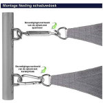 Het Nesling schaduwdoek is eenvoudig zelf op te hangen. Bij uw bestelling ontvangt u een uitgebreide montagehandleiding, zodat u direct aan de slag kunt. U bevestigt het doek gemakkelijk aan uw huis, tussen palen of in een pergola. Voor de bevestiging hebben wij hoogwaardige RVS bevestigingsmaterialen beschikbaar. Het schaduwdoek is vuilafstotend en schimmelwerend, en kan eenvoudig gereinigd worden met wat lauw water en groene zeep.