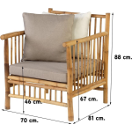 De Bamboo loungestoel inclusief kussen heeft een hoogte van 86 cm, breedte van 72 cm en een totale diepte van 80 cm. De zithoogte is 46 cm en de zitdiepte inclusief het rugkussen is 46 cm. De armleuningen bevinden zich op een hoogte van 67 cm vanaf de grond. Het potenframe heeft een diameter van 4,5 cm en de loungestoel kan een maximale draagkracht van 100 kg aan. Om de levensduur van het meubel te verlengen, is het aan te raden om het eens per jaar te behandelen met speciale Bamboe Protector.