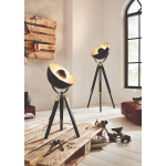 De driepoots vloerlamp Covaleda is een ware trendsetter met zijn kleurencombinatie van zwart en goud. Het houten driepoots-frame is voorzien van trendy goudkleurige metalen details, zoals eindkappen, verstevigingen en vleugelschroeven, die een speels contrast vormen met het zwarte hout. De halve bolvormige metalen kap zit in een beugel en kan naar binnen gezwenkt worden. Aan de buitenkant is de kap zwart en aan de binnenkant goud, waardoor het licht een warme uitstraling krijgt.