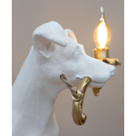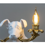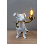 Waar heeft deze ondeugende hond toch de lamp gestolen? Maak kennis met de Rio Lamp tafellamp, een uniek decoratief stuk dat een kleine hondenfiguur toont die een prachtige gouden kaarslamp draagt in rococostijl. Je kunt duidelijk de sporen zien van waar de lamp van zijn oorspronkelijke plaats aan de muur is weggehaald, aangegeven door de losse uiteinden van de verbindingskabels. Maar maak je geen zorgen, want deze lamp is volledig functioneel en veilig.