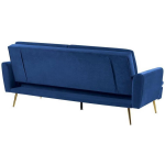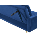 De elegante goudkleurige poten geven deze slaapbank een luxe uitstraling. Het blauwe fluweel vormt een prachtig contrast met de goudkleurige accenten. Dit maakt de slaapbank niet alleen functioneel, maar ook een echte eyecatcher in jouw woonruimte.