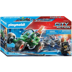 Deze dief is niet bang voor iets. Hij is vastbesloten om de kluis te stelen en schroomt niet om hem met een touw aan zijn kart vast te binden en gewoon uit de muur te trekken. Nu scheurt hij in volle vaart door de straten, met de kluis als zijn trofee achter zich aan. Maar wat hij niet heeft voorzien, is dat hij wordt geconfronteerd met de dappere PLAYMOBIL-politie. Een dappere politieagent stapt in zijn behendige politiekart en komt razendsnel in actie.