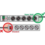 De Super-Solid 8-voudige stekkerdoos is uitgerust met een verlichte veiligheidsschakelaar die tweepolig aan/uit kan worden geschakeld. Daarnaast heeft deze stekkerdoos een hogere contactbescherming en kinderbeveiliging, waardoor je met een gerust hart elektronische apparaten kunt aansluiten.Handige specificaties