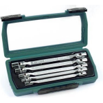 Deze set wordt geleverd met 5 dubbele kniesleutels met scharnierende uiteinden: 8-9/10-11/12-13/14-15/17-19 mm. De sleutels zijn gefabriceerd uit chrome-vanadium staal en hebben een gepolijste kop voor optimale duurzaamheid en functionaliteit. Bovendien wordt er een handige opbergkoffer meegeleverd, zodat u de sleutels altijd netjes bij elkaar kunt bewaren. De afmetingen van de koffer zijn 29 x 14 x 5 cm (L x B x H).