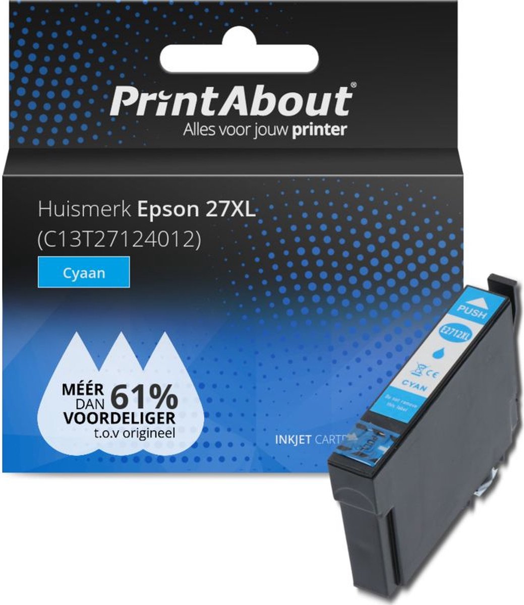 Met de Huismerk Epson 27XL (C13T27124012) Inktcartridge Cyaan Hoge capaciteit bespaar je direct op jouw printkosten. De Huismerk Epson 27XL (C13T27124012) Inktcartridge Cyaan Hoge capaciteit bevat meer inkt ten opzichte van het origineel. Door de grotere inhoud, bespaar jij aanzienlijk op jouw printkosten. Je bespaart in totaal 61% per afdruk ten opzichte van de originele inktcartridge. Eigenlijk krijg je dus standaard korting als je kiest voor het PrintAbout huismerk.