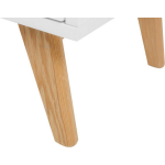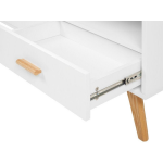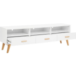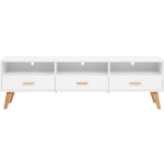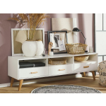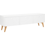De tv-kast is vervaardigd van stevig MDF in mat wit en is daarom niet alleen onderhoudsvriendelijk, maar ook vuil- en vochtafstotend. Met zijn stabiele constructie en eiken poten, biedt dit mediameubel ook een uitstekende duurzaamheid en stabiliteit.