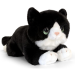 Deze pluche kat heeft een prachtige zwarte kleur met witte accenten en heeft schattige kraalogen. Hij ligt op zijn buik en is ongeveer 32 cm groot. De knuffel is gemaakt van zacht polyester materiaal en heeft een stevig plastic binnenwerk. Hierdoor kan de knuffel tegen een stootje en is hij geschikt voor urenlang speelplezier.