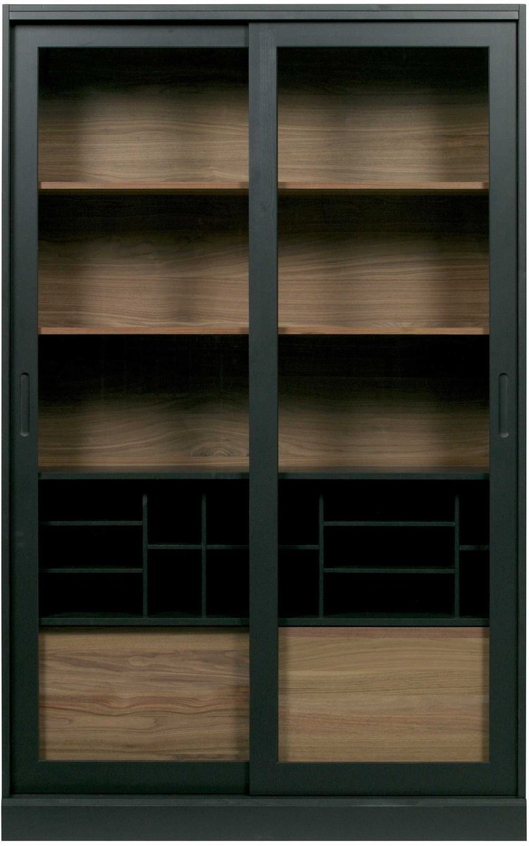 De elegante vitrinekast James van WOOOD is een absolute eyecatcher in elk interieur. Met zijn zwarte gelakte grenen buitenkant en warme walnoothouten interieur biedt deze moderne en stijlvolle wandkast een speelse indeling waarin u al uw favoriete items kunt opbergen. Of het nu gaat om servies, woonaccessoires, boeken of reissouvenirs, de James vitrinekast is de ideale opbergoplossing. De kast wordt geleverd met schuifdeuren met glas, 3 ruime planken, 2 schuifdeuren en maar liefst 14 open vakken. De ruimte tussen de planken is 33,3 cm, waardoor u genoeg flexibiliteit heeft in het opbergen van items van verschillende groottes.