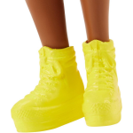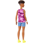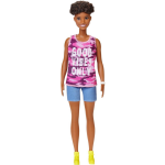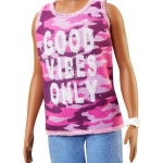 De Barbie pop in deze collectie heeft een modernere uitstraling, met kleinere borsten en een unieke fashion sense. Ze draagt een roze camouflage-top met de motiverende tekst 'Good vibes only' en combineert dit met een hippe denimshorts. Om haar look compleet te maken, draagt ze gele gympen en een stijlvol wit horloge. Deze nieuwe Barbie is een frisse wind in de wereld van modepoppen.