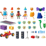 De Playmobil Kids Club is dé plek waar alle kleine vakantiegasten uitgebreid kunnen ravotten, spelen en dansen. Hier vinden kinderen een scala aan activiteiten om te ontdekken, zoals het rijden op de go-kart, schilderen, lezen en spelen. Bovendien kunnen kleine zangtalenten hun vaardigheden laten zien op het showpodium. Maar het hoogtepunt van de Kids Club is ongetwijfeld de verkleedkist, gevuld met talloze grappige kostuums waarmee kinderen zichzelf kunnen transformeren. Met een PLAYMOBIL figuur en drie PLAYMOBIL kinderfiguren, een podium met microfoon en staande luidsprekers, een kist vol kostuums, een go-kart, schildersmateriaal, boeken en vele andere accessoires, biedt deze speelset oneindig speelplezier. Laat je creativiteit de vrije loop en bouw je eigen avontuur met de puzzelelementen van het stuiterspel.