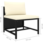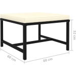 De loungeset is uitgevoerd in een elegant zwart. Dit geeft de set een tijdloze uitstraling die perfect past bij elke tuinstijl. De crèmewitte kussens zorgen voor een mooi contrast en geven een luxe uitstraling. De set bestaat uit een hoekbank, twee middenbanken, twee voetenbanken en bijpassende kussens, met een zitkussen dikte van 5 cm. De afmetingen van de verschillende onderdelen zijn: middenbank (54 x 60 x 60 cm),hoekbank (60 x 60 x 60 cm) en voetenbank (60 x 60 x 32 cm).