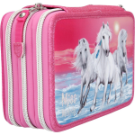 Ben jij een echte paardenliefhebber en wil je graag de mooiste etui hebben? Dan is dit etui met een prachtige afbeelding van drie galopperende paarden door het water echt iets voor jou! Met zijn schattige roze kleur en glinsterende glitters is dit etui absoluut de eyecatcher van het schooljaar.