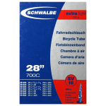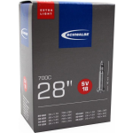 De Schwalbe binnenband heeft een ERTO maat van 28/44-622 en een frans ventiel. Het gewicht bedraagt slechts 105 gram, waardoor je fiets licht en wendbaar blijft. De zwarte kleur past bij elke fietsstijl en de lengte van het ventiel is 40 mm. Deze binnenband is geschikt voor een wielmaat van 28 inch. Bij aankoop ontvang je één Schwalbe Binnenband, model SV18, extra licht, met de specificaties 28 inch x 1.10 - 1.65, en een frans ventiel van 40 mm lengte.
