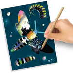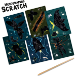 Wauw! Deze scratchkaarten zijn wel heel speciaal! Verborgen onder de kraslaag wachten coole insecten op je, die een prachtig holografisch kleureffect hebben. Met de bijgeleverde houten kraspen kun je je eigen unieke patronen tekenen op de insecten en ze nog meer laten glinsteren!