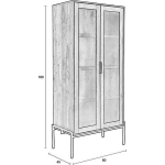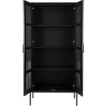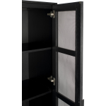 Een van de meest opvallende kenmerken van deze stijlvolle kast zijn de deurtjes, die zijn ingelegd met een licht opengewerkt zwart metaal. Dit zorgt voor een subtiel doorschijnend effect, waardoor de inhoud van de kast elegant wordt gepresenteerd. Daarnaast oogt de kast luchtig dankzij het dunne, zwart metalen onderstel.